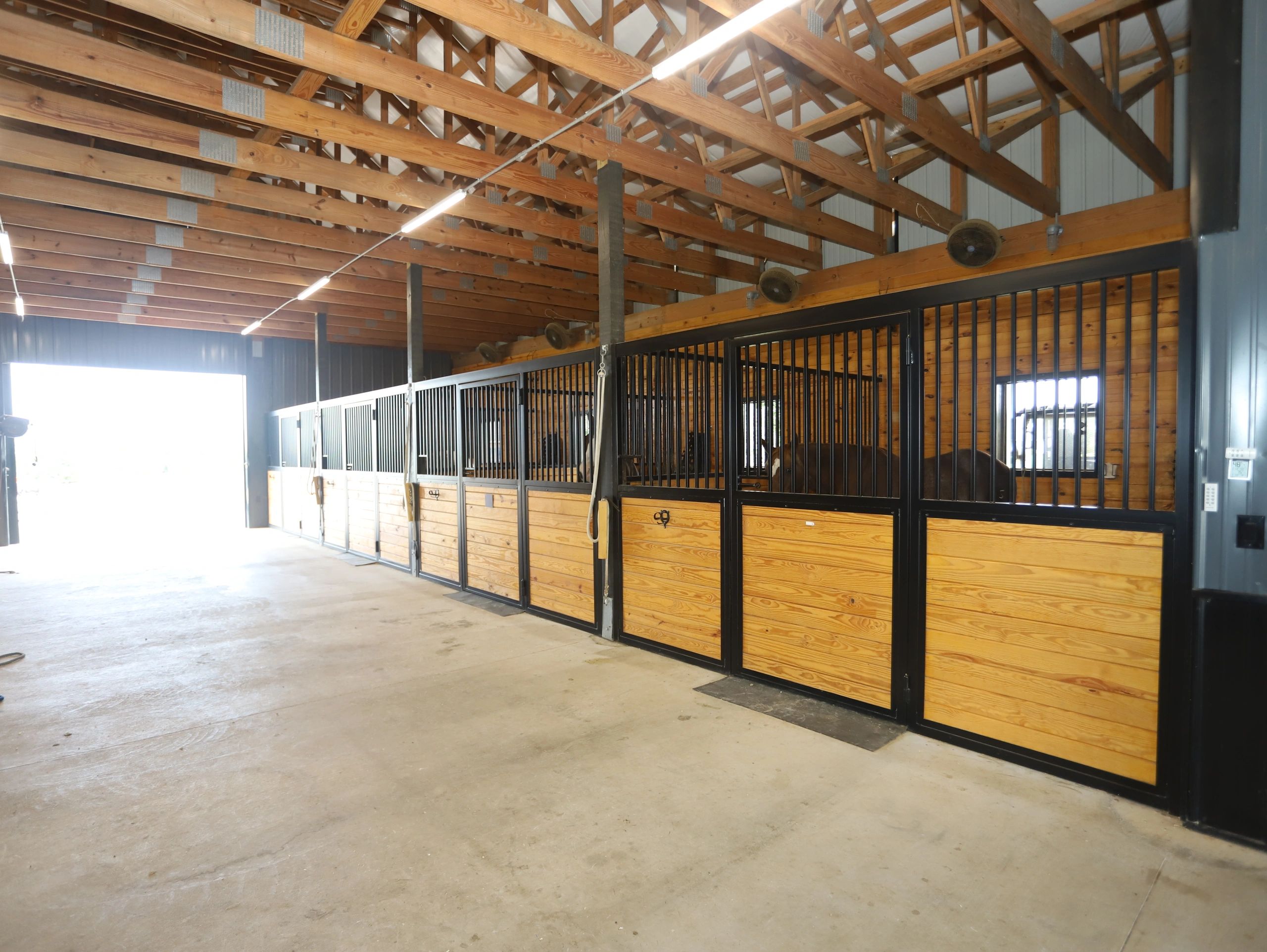 A 12x14 stall equipped with comfort mattress cushion your horse during their time inside the stall. Each stall is appointed with a fan and camera giving you piece of mind while you are away.